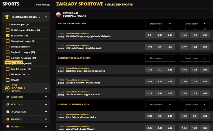 Innowacyjny jest również system wyszukiwania interesujących Cię wydarzeń sportowych. Zlokalizowany jest on nie tylko po prawej stronie witryny, ale również posiada osobną zakładkę w górnym panelu nawigacyjnym. Kategorie sportowe podzielone zostały na rodzaje sportów, a następnie - kraje oraz ligi. Dzięki temu o wiele szybciej będziesz w stanie zlokalizować interesującą Cię rozgrywkę.
