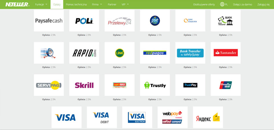 Neteller oferuje bardzo korzystne opcje przelewów, które posiadają nieduże opłaty. Jeśli depozytów dokonywać będziesz za pomocą tradycyjnego przekazu bankowego, Neteller nie pobierze od Ciebie żadnej opłaty. Niestety, jest to jedyna darmowa opcja. Jeśli wpłaty będziemy chcieli dokonać za pośrednictwem innych metod, trzeba liczyć się z opłatą wynoszącą od 0.5 procenta kwoty całkowitej, do 7.5 procent, w zależności od wybranej metody.
